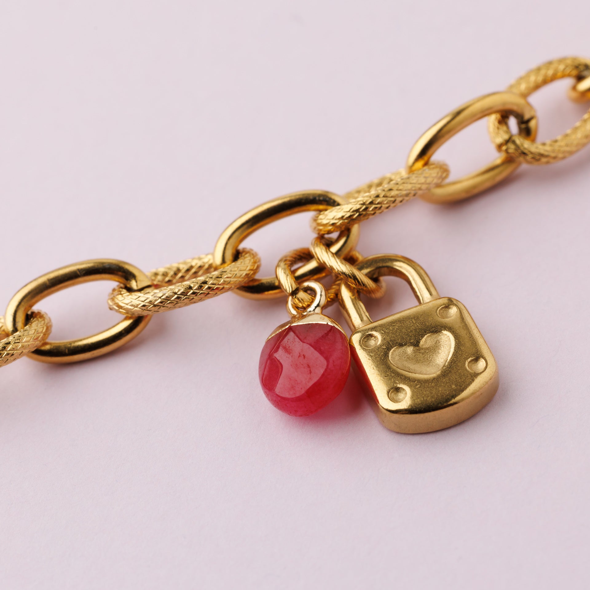 Le bracelet Carry est composé d'une chaine à maillon large en acier inoxydable doré assorti d'un cadenas et charm en jade rouge.