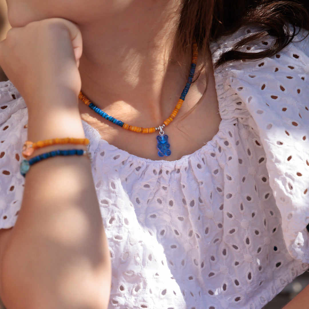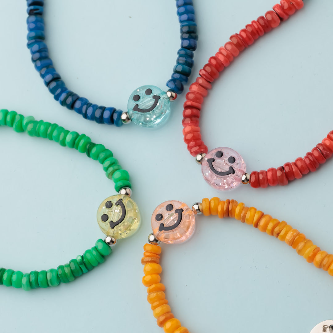 Il est composé en acier inoxydable, assortit de perles heishi (coquillage) bleu et d'une perle smiley en résine.