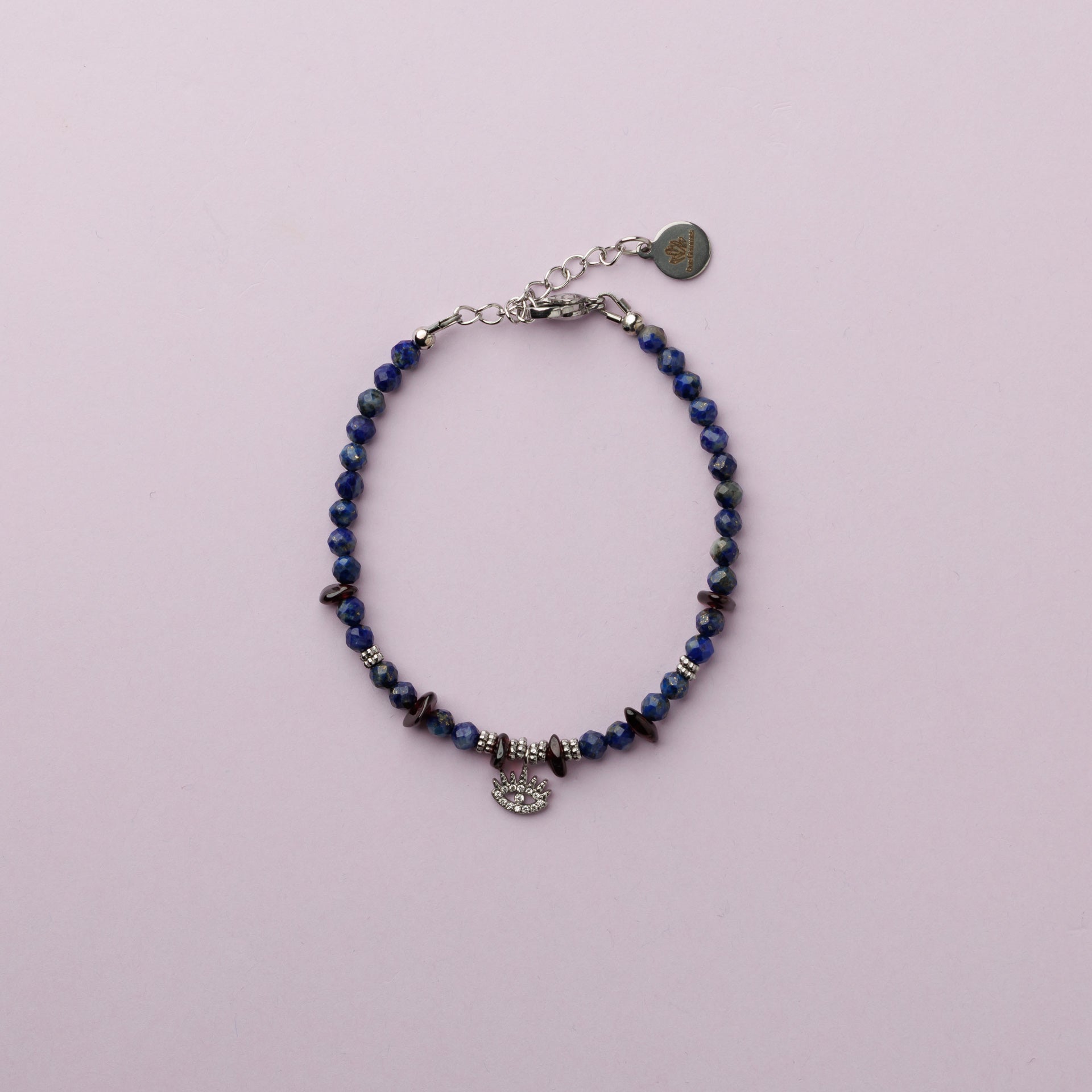 Le bracelet Ambroise est composé de perles fines facettées en lapis lazuli 4mm, de ships grenat et d'un pendentif œil argent en acier inoxydable.