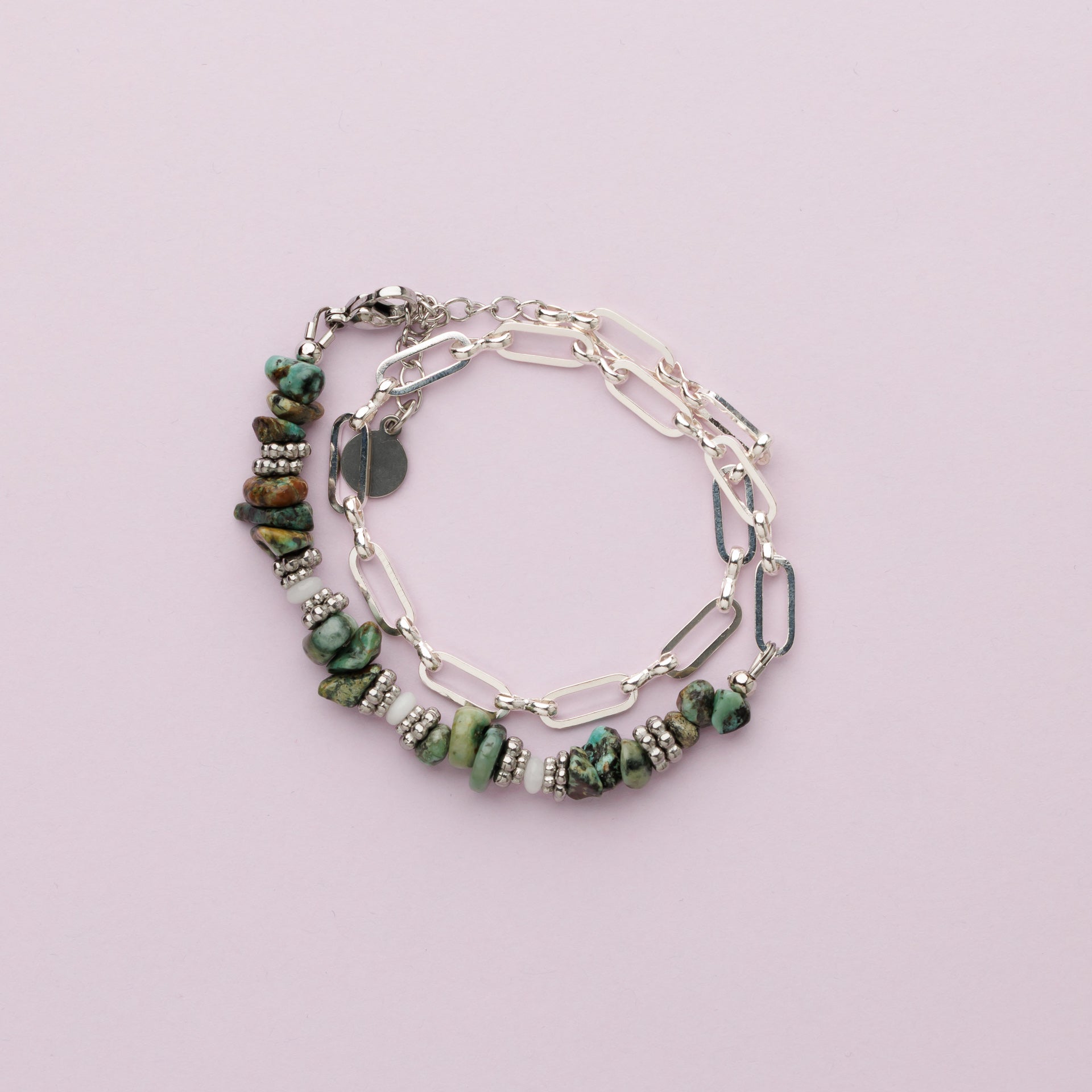 Bracelet double rang en maille rectangle plaqué argent composé de pierres fines en turquoise Africaine (ships) et jade blanc.