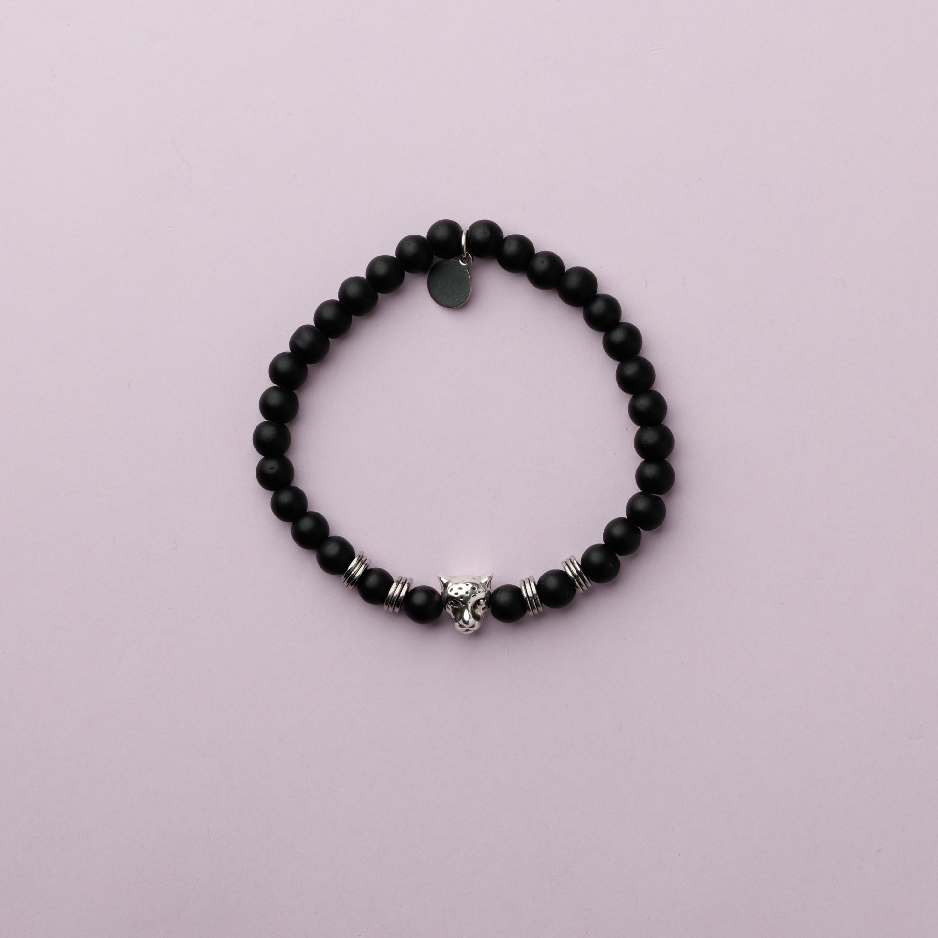 Bracelet pierres fines en onyx noir 6mm et d'une perle centrale panthère en plaqué argent.