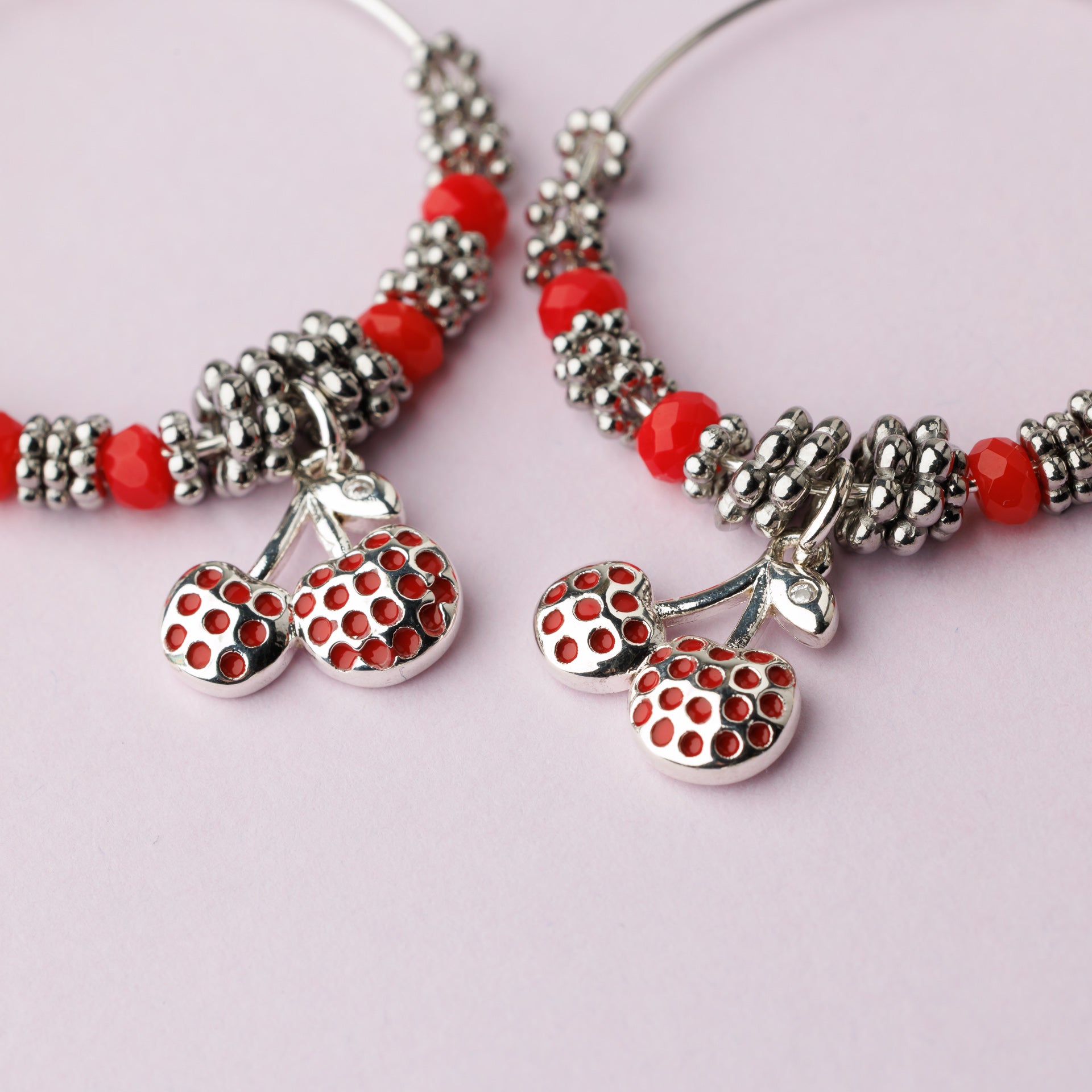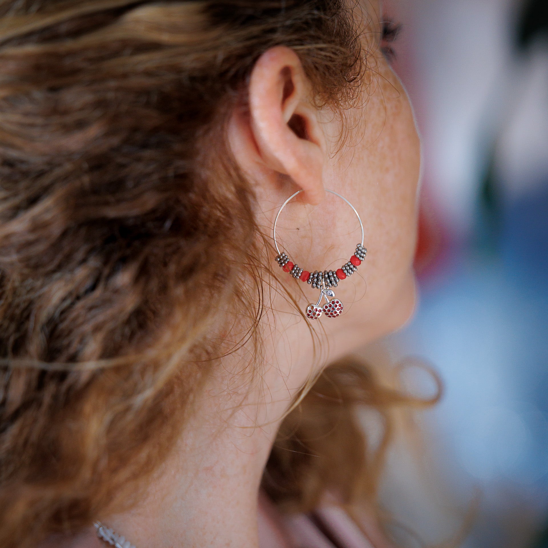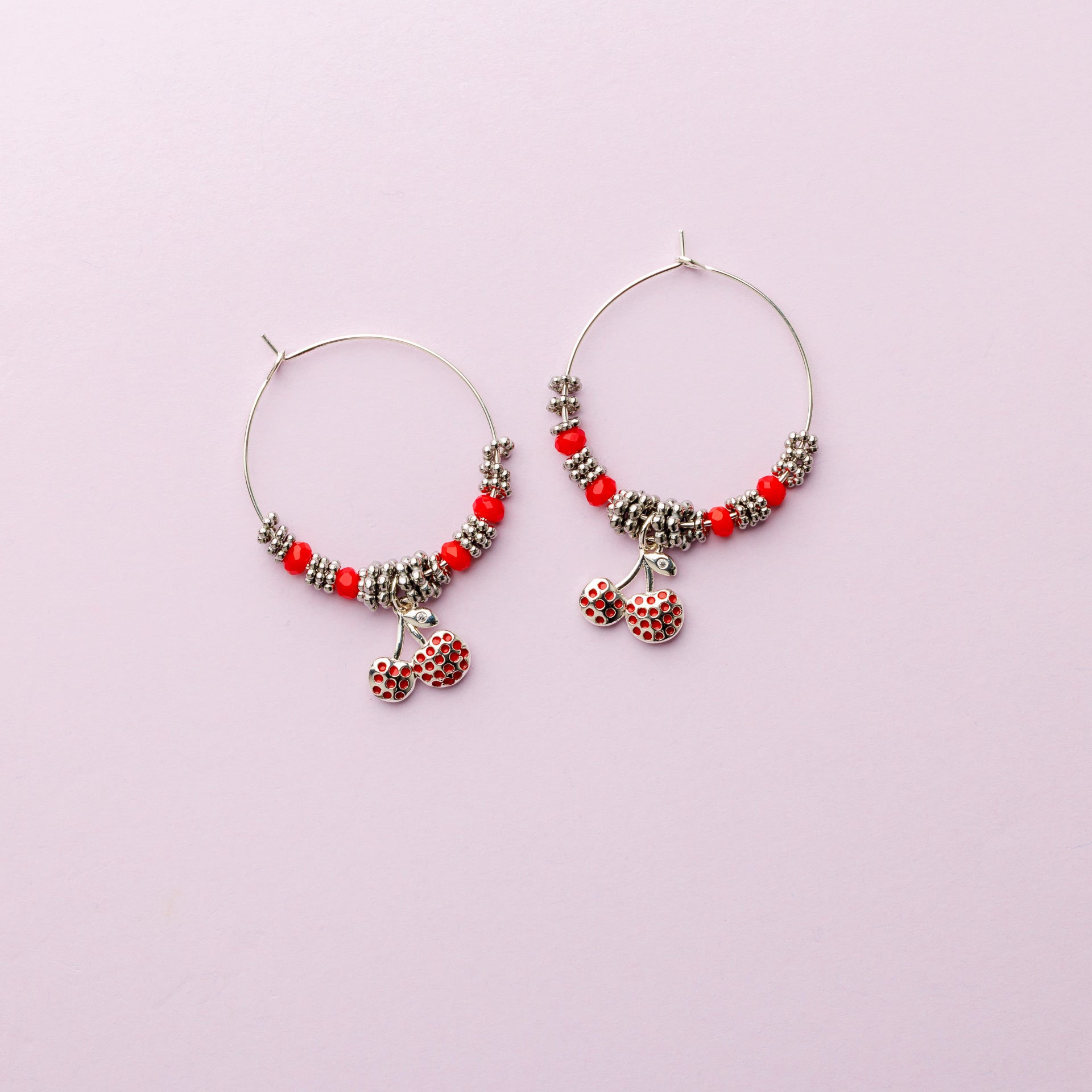 Créole plaqué argent composée de pierres fines facettées en jade rouge 4 mm, rondelles fleurs et pendentif cerise.