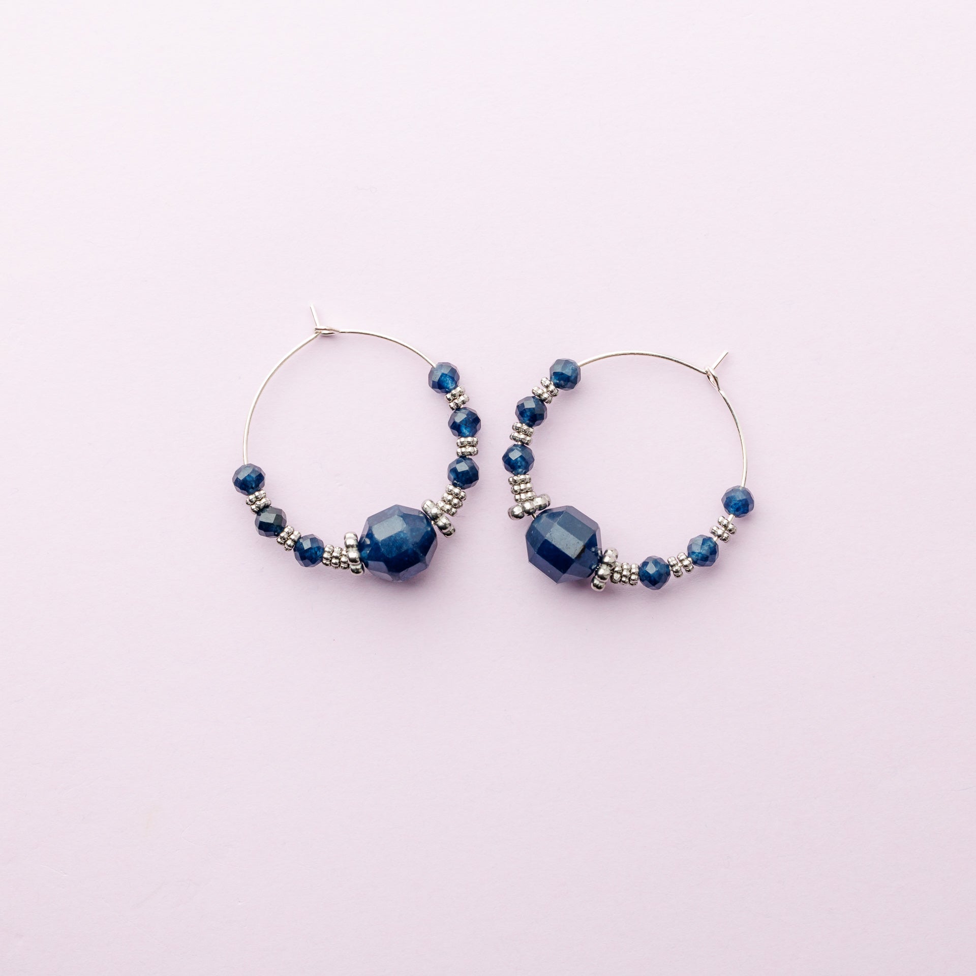 Créole plaqué argent composée de pierres fines facettées en saphir 4 mm, rondelles fleurs et grosse perle centrale en saphir.
