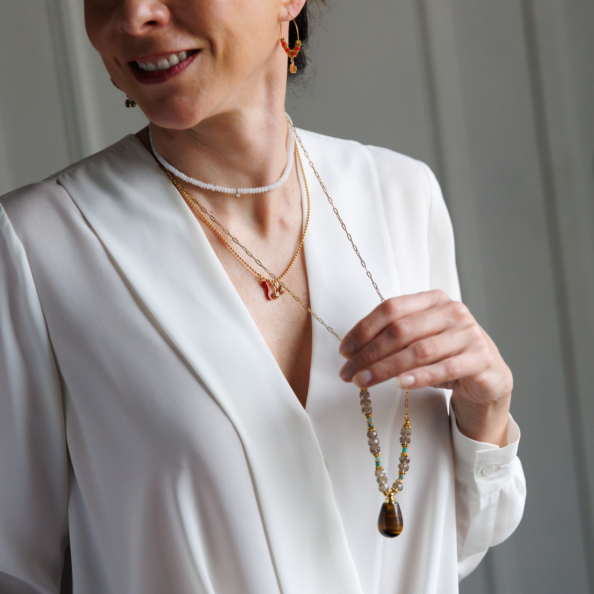 Sautoir argent - Quartz fumé et œil de tigre - FIONA