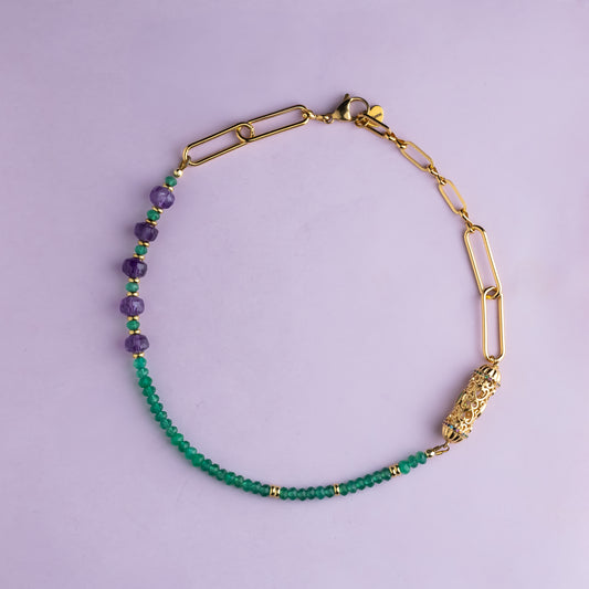 Bracelet double rang en maille or - Onyx vert - Quartz - Améthyste - INDIANA